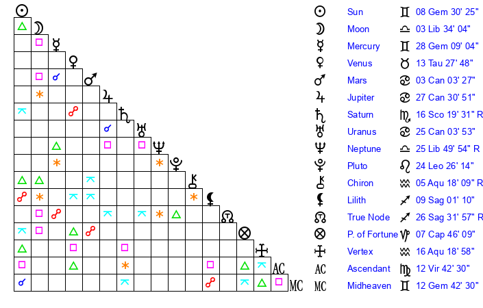 | Moon | 3 Libra 38 | 28 Cancer 11 | 14 Aries 31 |