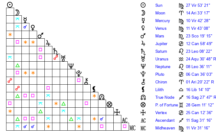 | Moon | 14 Aries 21 | 27 Virgo 27 | 9 Pisces 34 |