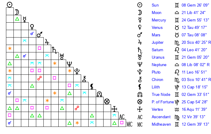 | Sun | 8 Gemini 26 | 9 Gemini 32 | 22 Leo 58 |