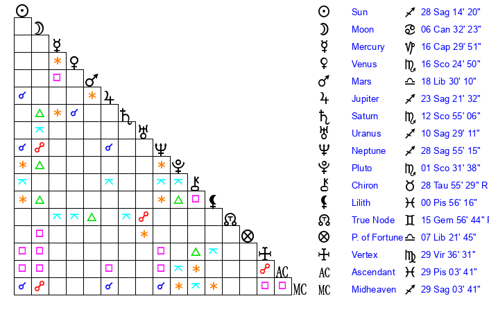 Sun | 28 Sagittarius 14 | 29 Sagittarius 18 | 10 Aquarius 0 |