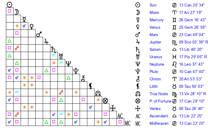 | Moon | 17 Aries 26 | 24 Scorpio 25 | 16 Capricorn 54 |