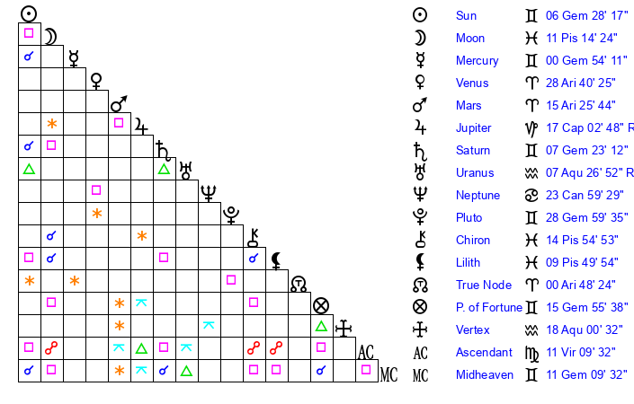 | Moon | 11 Pisces 10 | 25 Gemini 47 | 14 Aries 41 |