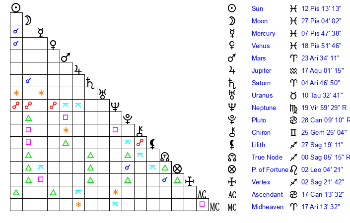| Sun | 12 Pisces 13 | 13 Pisces 7 | 7 Gemini 24 |