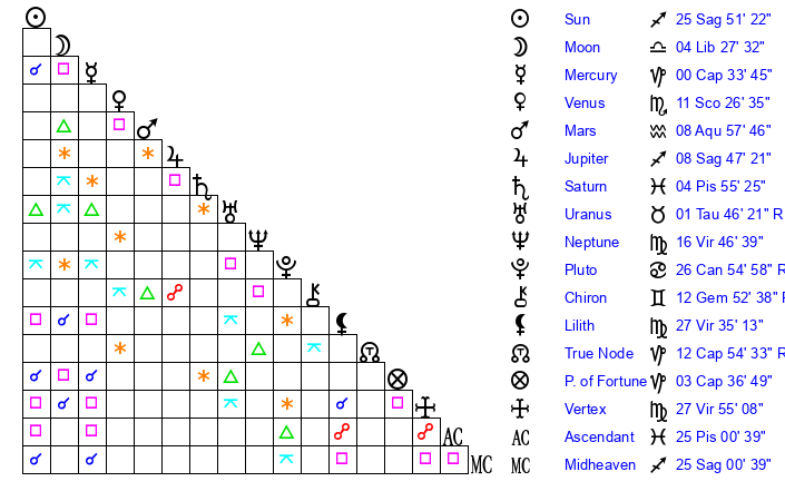 | Sun | 25 Sagittarius 51 | 27 Sagittarius 1 | 26 Pisces 56 |