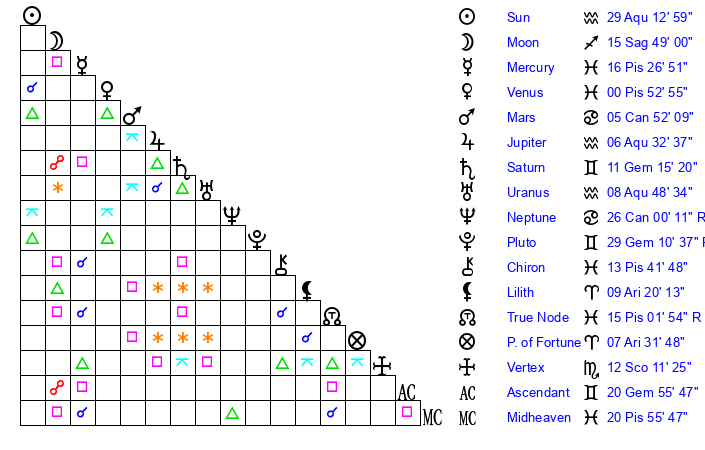 | Sun | 29 Aquarius 13 | 0 Pisces 17 | 17 Gemini 59 |