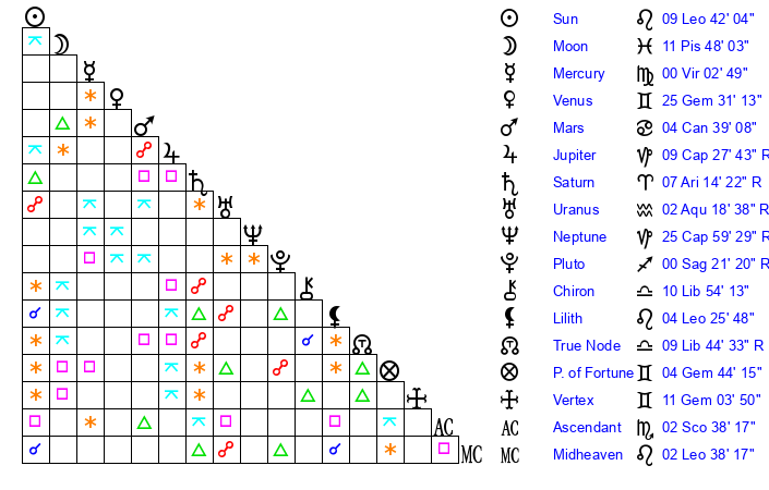Sun | 9 Leo 42 | 9 Leo 42 | 7 Virgo 35 |
