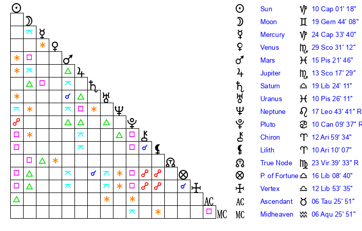 | Saturn | 20 Libra 1 | 26 Pisces 6 | 16 Libra 57 |