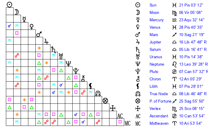 | Uranus | 10 Pisces 14 | 23 Taurus 59 | 13 Pisces 34 |
