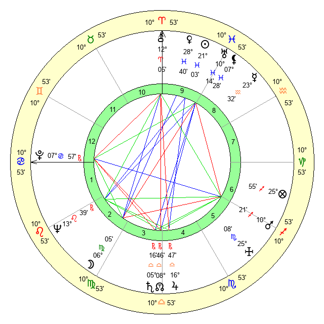 | Moon | 6 Virgo 12 | 0 Virgo 57 | 8 Gemini 45 |
