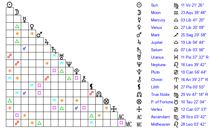 | Sun | 11 Virgo 21 | 12 Virgo 25 | 23 Sagittarius 58 |