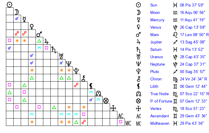 Moon | 16 Aquarius 8 | 4 Pisces 55 | 22 Pisces 8 |