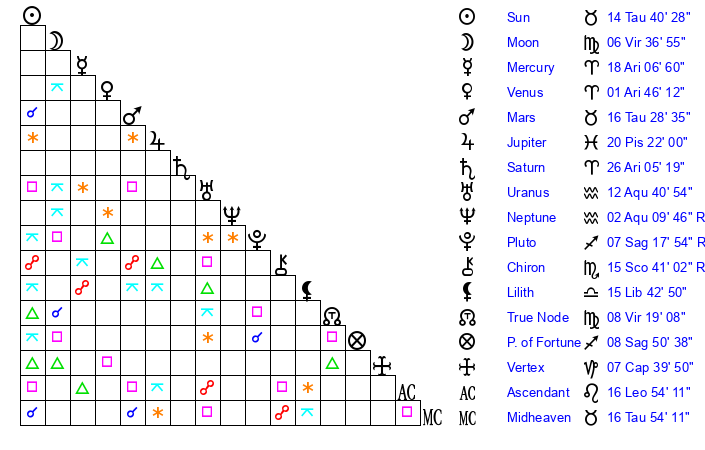 Sun | 14 Taurus 40 | 15 Taurus 7 | 10 Gemini 41 |