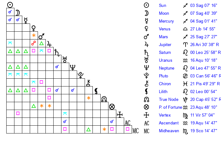 | Moon | 7 Sagittarius 32 | 3 Aquarius 30 | 0 Sagittarius 55 |