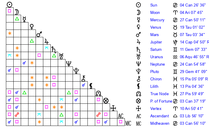| Moon | 4 Aries 0 | 22 Cancer 20 | 8 Taurus 55 |