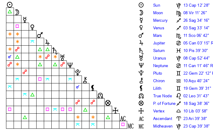 | Moon | 8 Virgo 10 | 14 Pisces 47 | 12 Capricorn 3 |