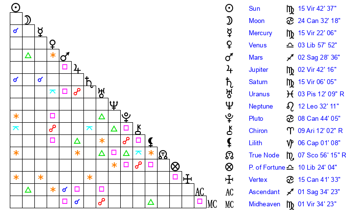 | Mercury | 15 Virgo 23 | 11 Virgo 53 | 16 Sagittarius 38 |
