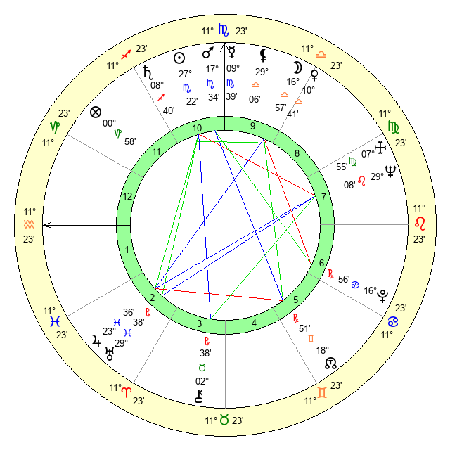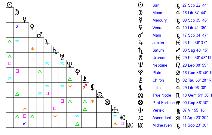 | Moon | 16 Libra 59 | 3 Sagittarius 16 | 18 Taurus 6 |
