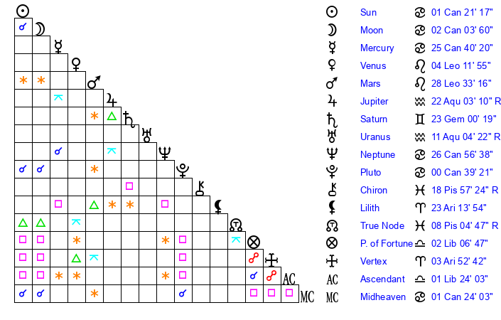| Pluto | 0 Cancer 39 | 3 Aquarius 16 | 2 Cancer 12 |