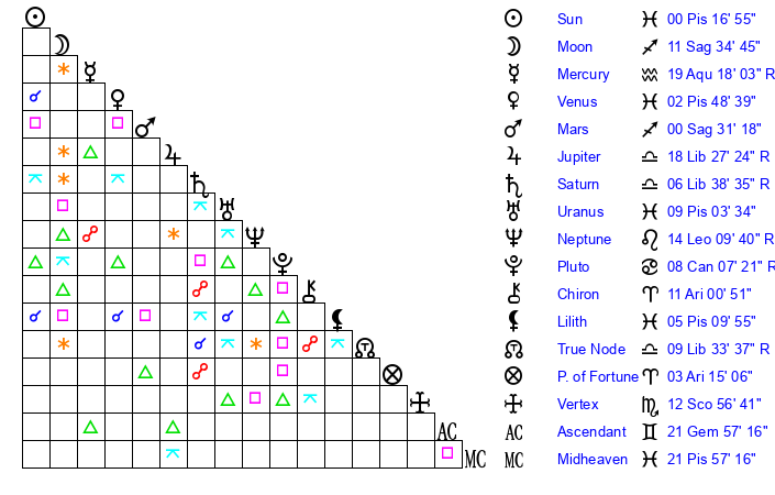 | Sun | 0 Pisces 17 | 1 Pisces 18 | 11 Gemini 21 |
