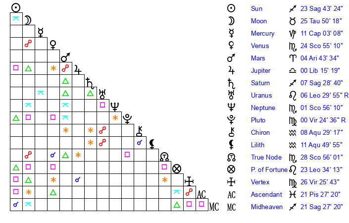 | Saturn | 7 Sagittarius 53 | 25 Pisces 20 | 14 Sagittarius 0 |
