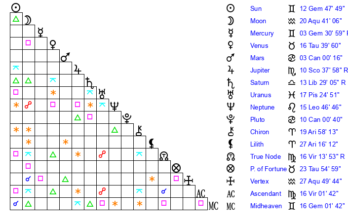 | Sun | 12 Gemini 48 | 14 Gemini 5 | 20 Virgo 36 |