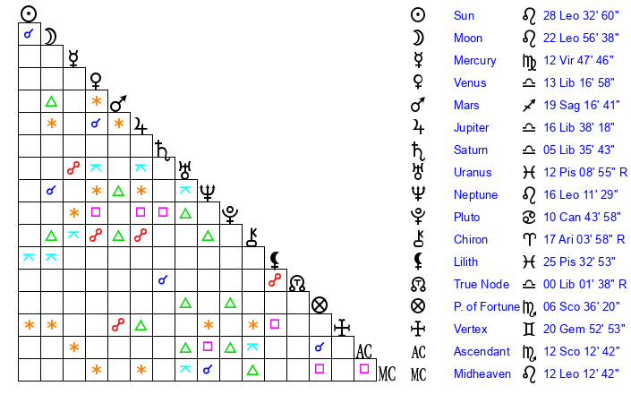 | Sun | 28 Leo 33 | 29 Leo 37 | 10 Sagittarius 30 |