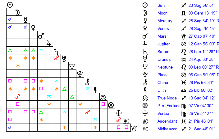 | Sun | 23 Sagittarius 57 | 24 Sagittarius 59 | 11 Aries 54 |