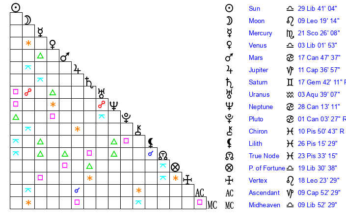 | Sun | 29 Libra 41 | 0 Scorpio 32 | 23 Aquarius 9 |