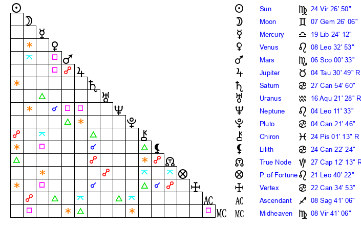 | Sun | 24 Virgo 27 | 25 Virgo 3 | 13 Capricorn 48 |