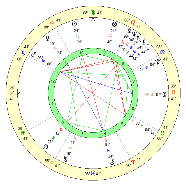 | Moon | 7 Gemini 36 | 6 Leo 20 | 3 Gemini 45 |