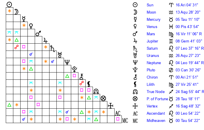 | Moon | 13 Aquarius 32 | 6 Leo 44 | 14 Capricorn 13 |