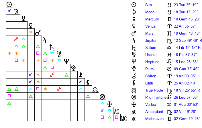| Moon | 18 Taurus 14 | 25 Sagittarius 26 | 19 Aquarius 28 |