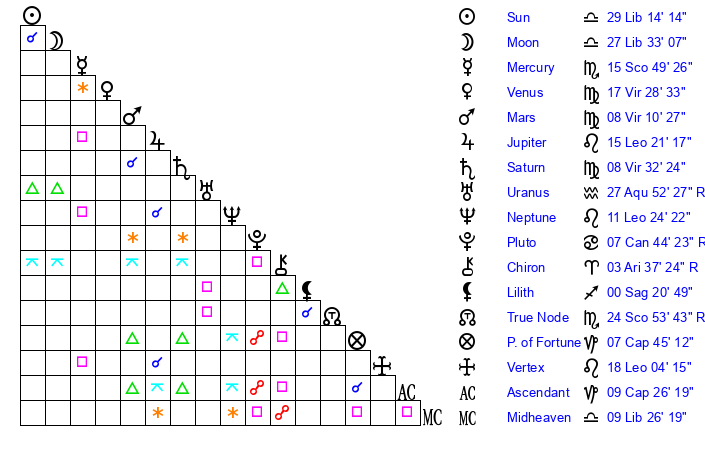 | Moon | 27 Libra 29 | 24 Scorpio 27 | 17 Virgo 3 |
