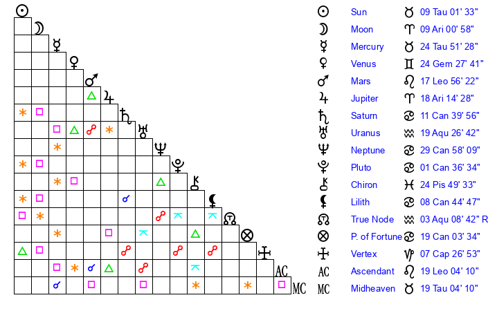 | Moon | 8 Aries 54 | 6 Gemini 33 | 7 Aries 2 |