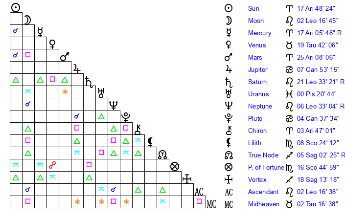 | Moon | 2 Leo 20 | 1 Virgo 40 | 12 Gemini 54 |