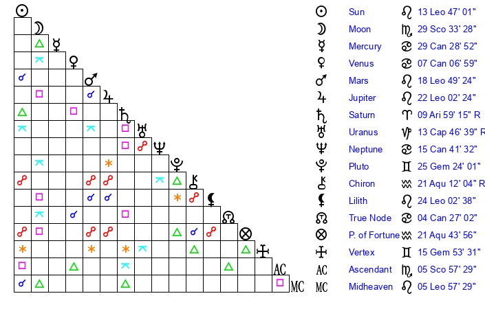 | Sun | 13 Leo 47 | 14 Leo 29 | 9 Sagittarius 8 |