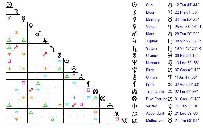 | Sun | 12 Taurus 42 | 13 Taurus 30 | 22 Leo 17 |