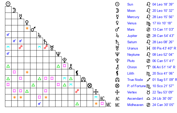 | Moon | 20 Leo 10 | 20 Virgo 20 | 6 Cancer 28 |