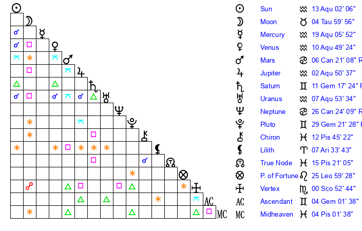 | Sun | 13 Aquarius 2 | 14 Aquarius 6 | 2 Gemini 39 |