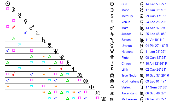 | Venus | 24 Leo 29 | 8 Cancer 46 | 3 Capricorn 38 |