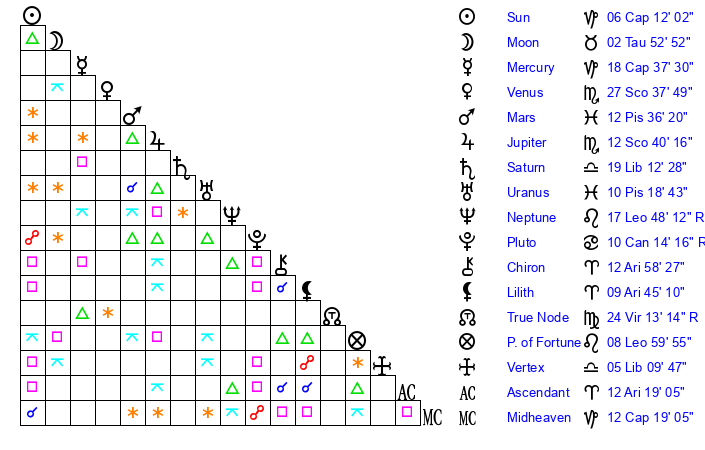 | Mars | 12 Pisces 36 | 10 Capricorn 10 | 26 Taurus 18 |