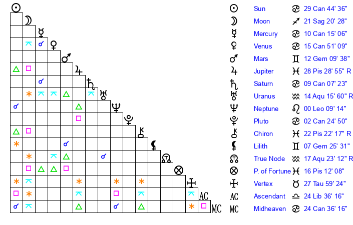 | Venus | 15 Cancer 51 | 21 Gemini 25 | 2 Sagittarius 27 |