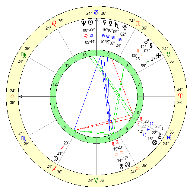 | Sun | 29 Cancer 44 | 1 Leo 5 | 17 Scorpio 13 |