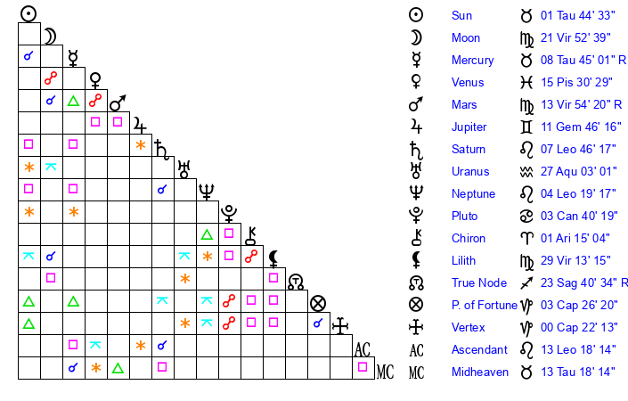 | Sun | 1 Taurus 44 | 2 Taurus 49 | 14 Leo 21 |