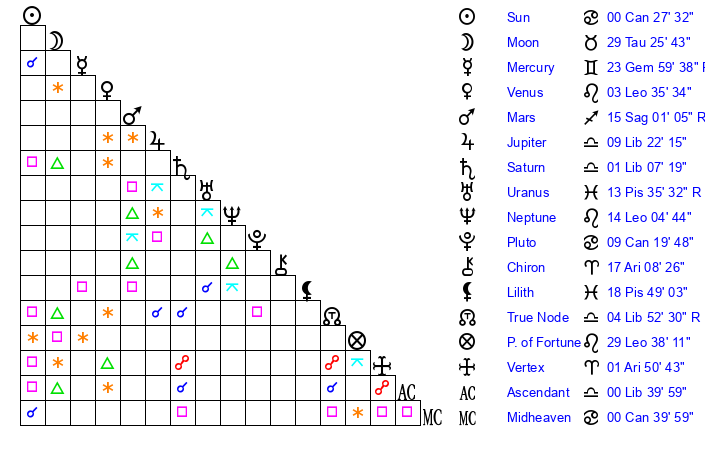 | Mercury | 24 Gemini 0 | 24 Cancer 17 | 0 Scorpio 11 |