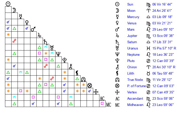 | Neptune | 18 Leo 36 | 1 Aries 23 | 20 Leo 18 |