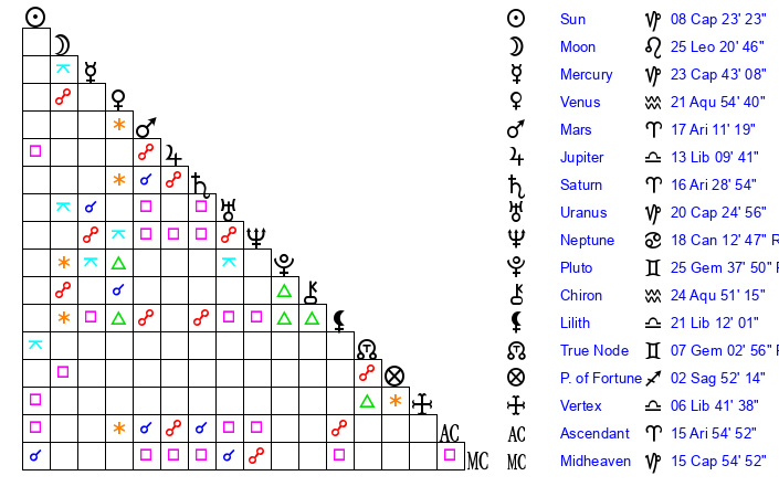 | Moon | 25 Leo 23 | 6 Capricorn 43 | 5 Scorpio 13 |