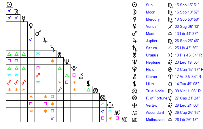 | Jupiter | 26 Scorpio 15 | 25 Cancer 9 | 16 Sagittarius 23 |