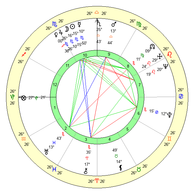 | Saturn | 26 Libra 17 | 25 Pisces 23 | 2 Scorpio 54 |