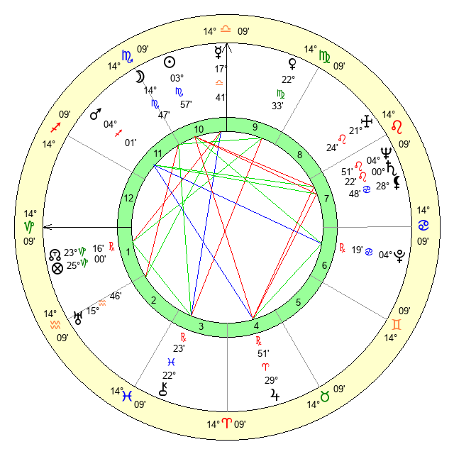 | Moon | 14 Scorpio 44 | 12 Capricorn 8 | 7 Scorpio 52 |
